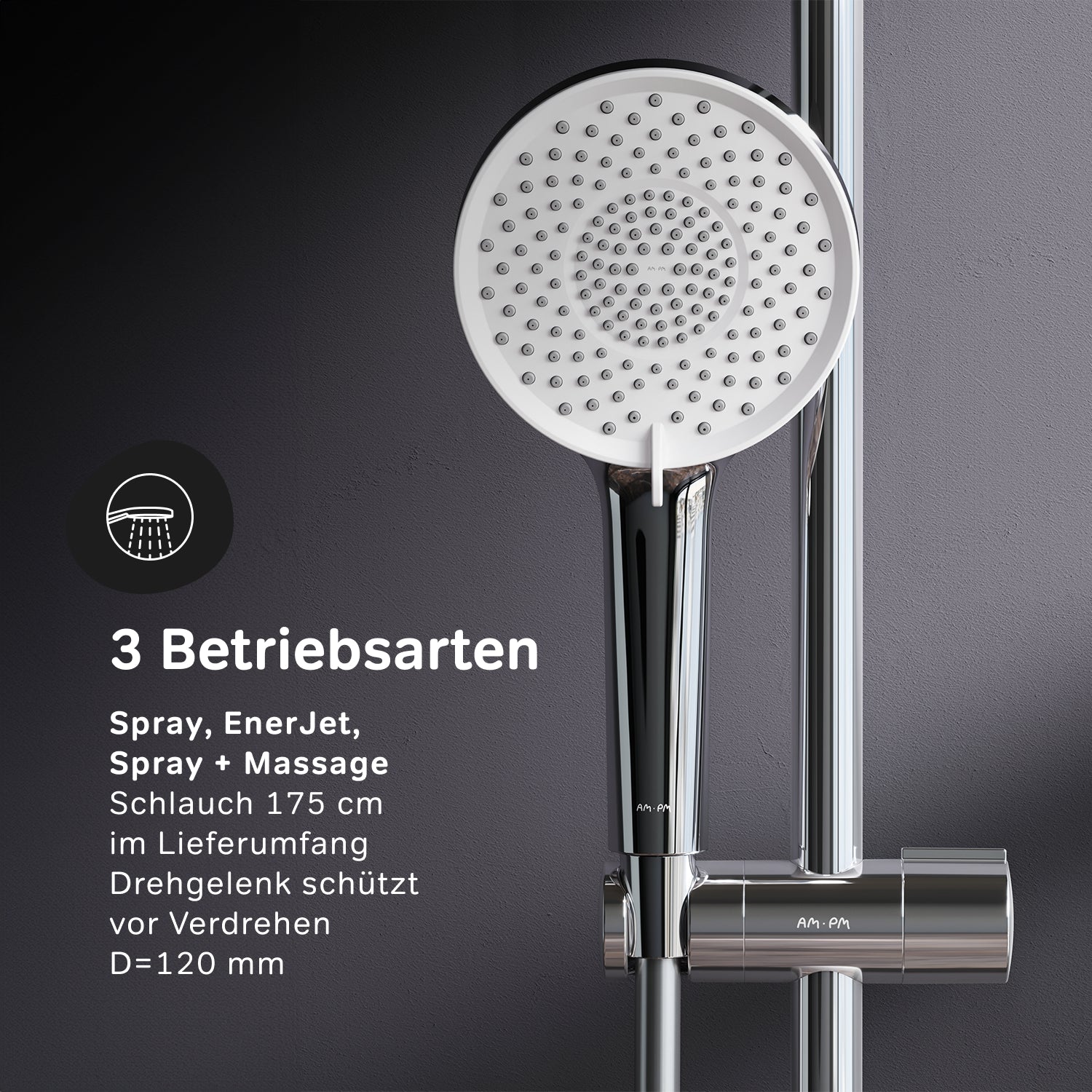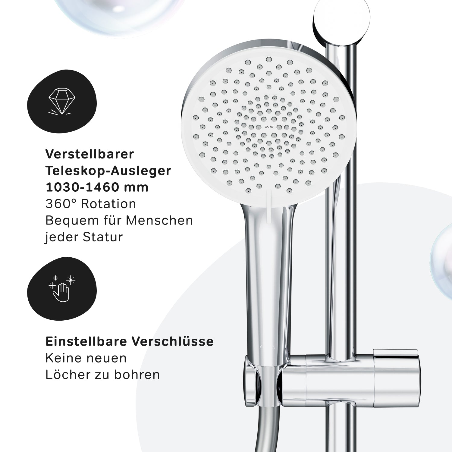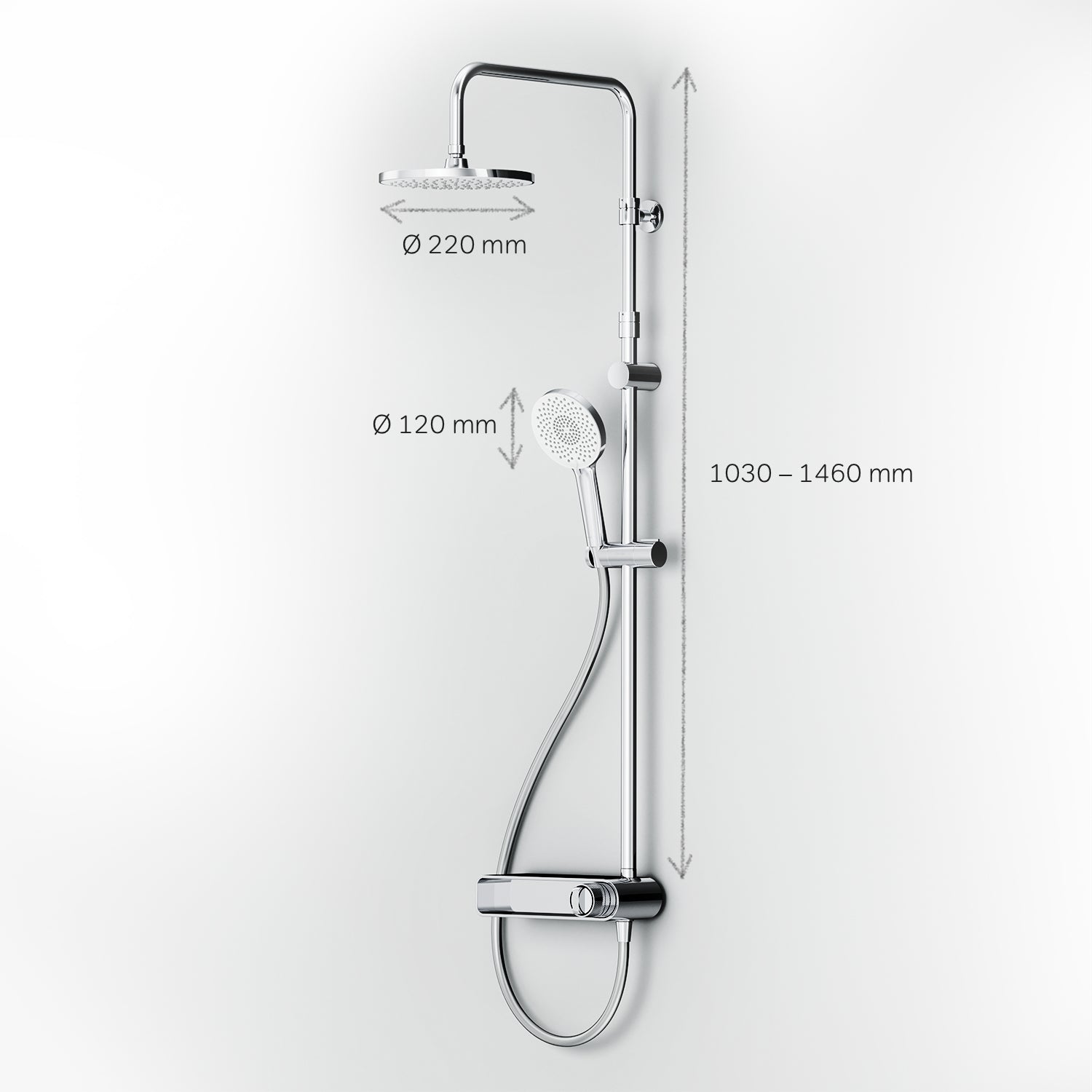 Une tringle de douche télescopique est réglable en hauteur de 1030 à 1460mm et offre un confort pour les personnes de toutes tailles. Grâce au diamètre accru de la douche à effet pluie (220mm) et de la douchette à main (120mm), vous découvrirez tous les avantages de l'utilisation d'un produit design. Le système de douche X-Joy est créé pour vous apporter de la joie au quotidien.
