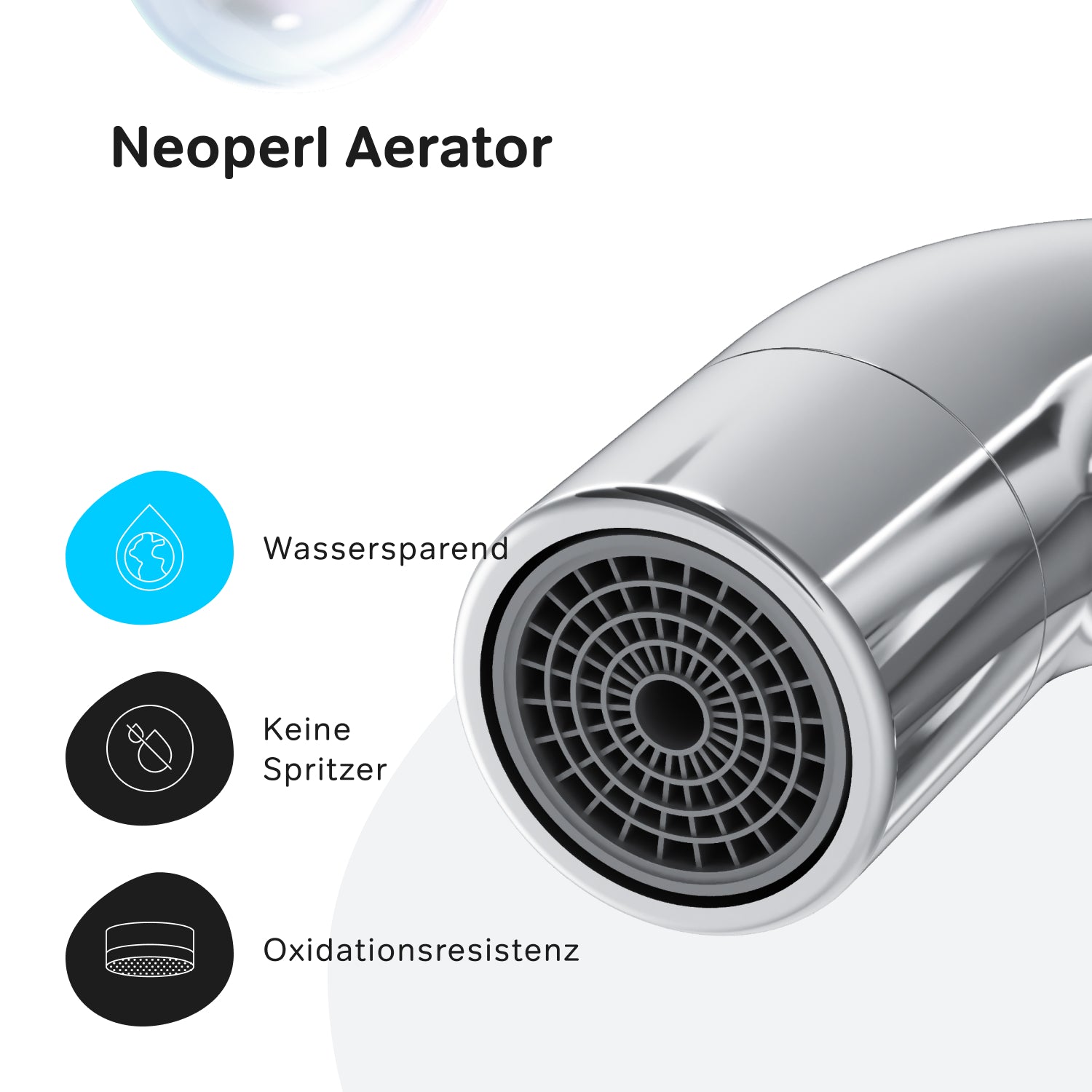 L'aérateur Air-In mélange le jet d'eau avec l'air, réduisant ainsi presque de moitié la consommation d'eau. La saturation du jet d'eau avec de l'air permet une forte pression d'eau même à basse pression dans le système.