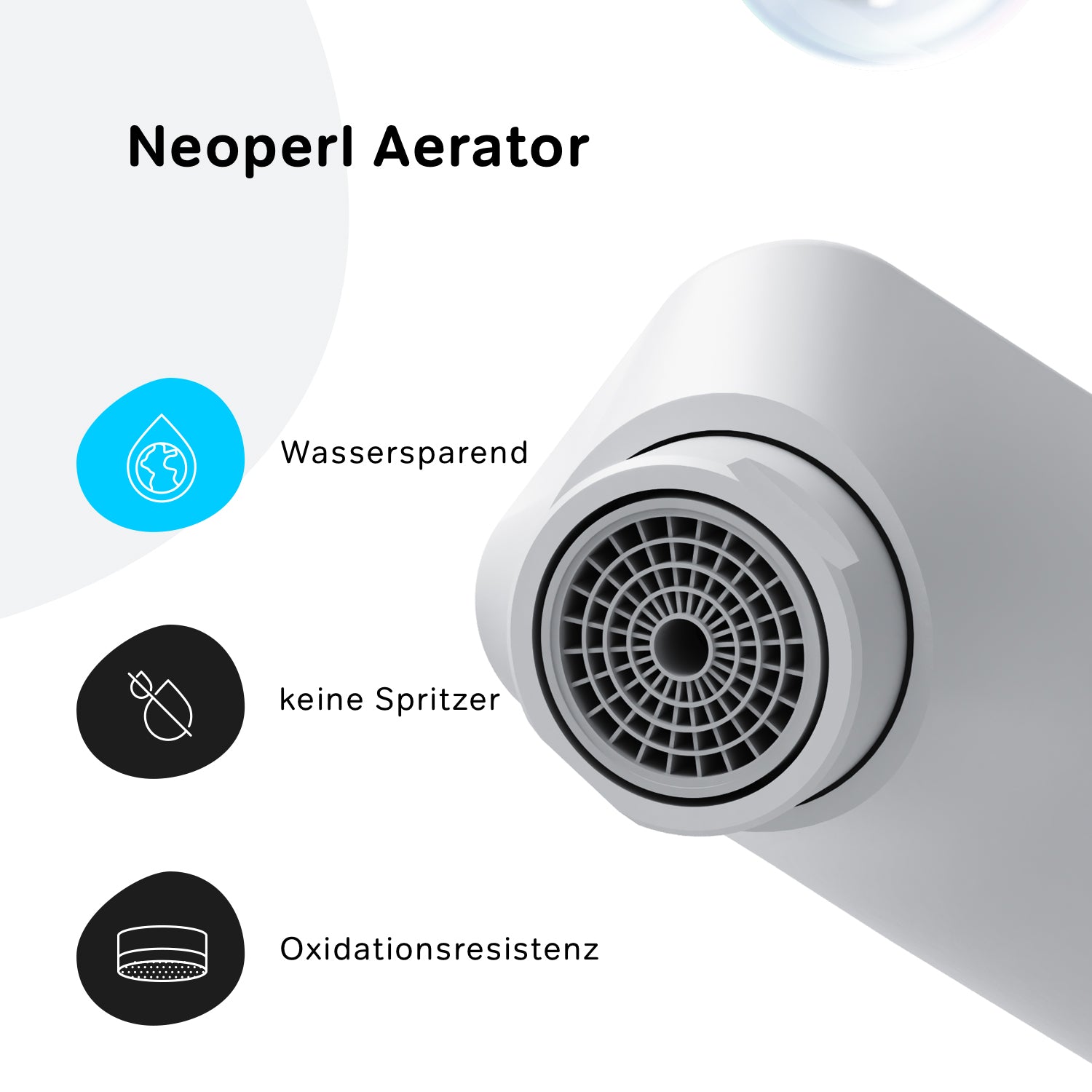 L'aérateur Neoperl utilise la technologie d'économie d'eau sans éclaboussures d'eau en mélangeant le jet d'eau avec de l'air.
