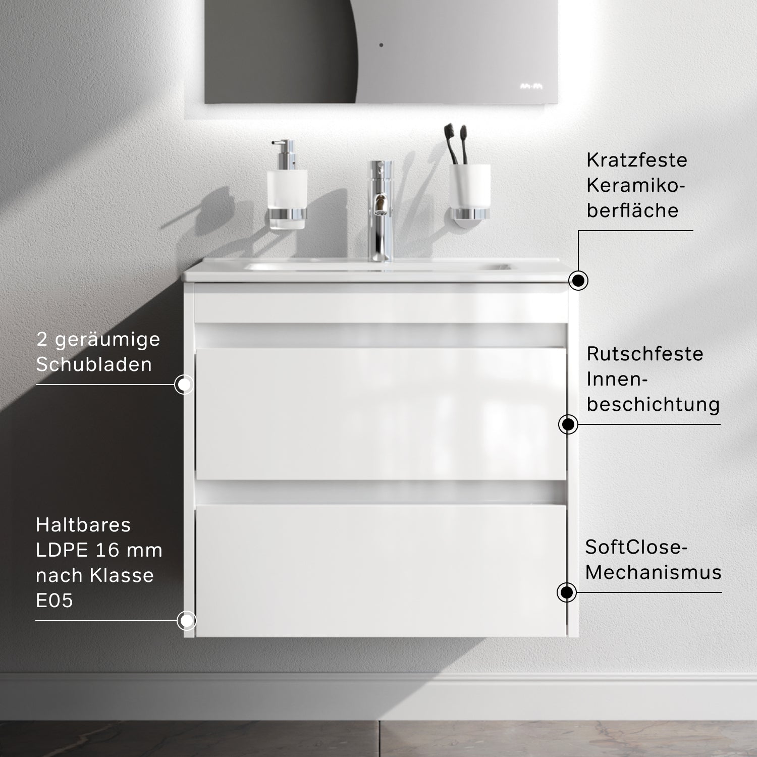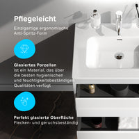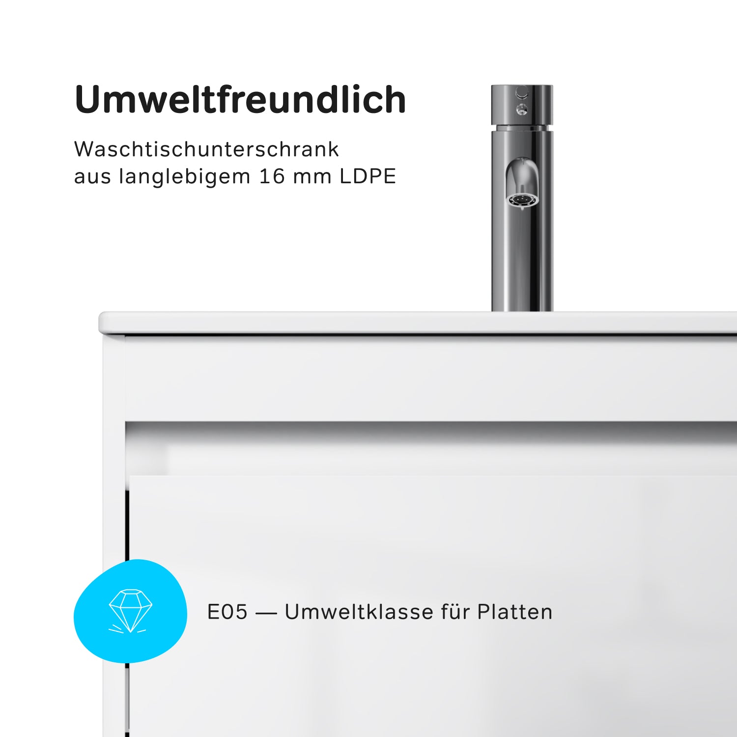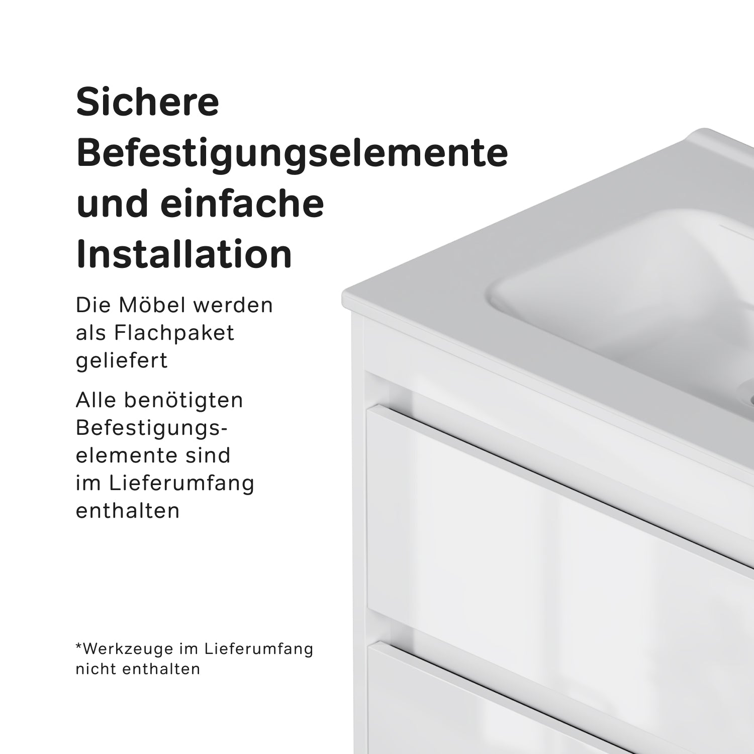 À l'intérieur du meuble, des guides-câbles astucieusement intégrés simplifient l'installation sans compromettre l'esthétique de la salle de bains. Fabriqué en aggloméré stratifié résistant à l'humidité, le meuble bas est à la fois pratique et durable. Ses dimensions compactes le rendent idéal pour les petites salles de bains où chaque centimètre compte.