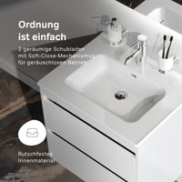 Deux tiroirs spacieux anthracite profond avec revêtement intérieur antidérapant offrent un rangement pratique et ordonné. Le système de fermeture amortie assure une ouverture et une fermeture silencieuses et fluides, tandis que des glissières invisibles soulignent le design épuré et minimaliste.