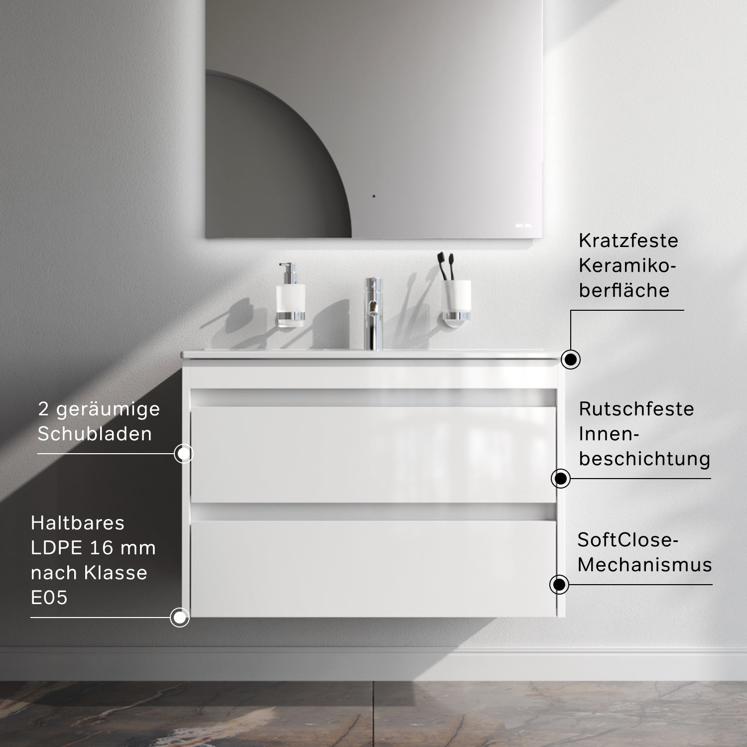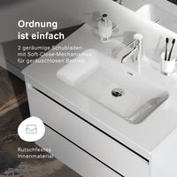 Deux tiroirs spacieux anthracite profond avec revêtement intérieur antidérapant offrent un rangement pratique et ordonné. Le système de fermeture amortie assure une ouverture et une fermeture silencieuses et fluides, tandis que des glissières invisibles soulignent le design épuré et minimaliste.