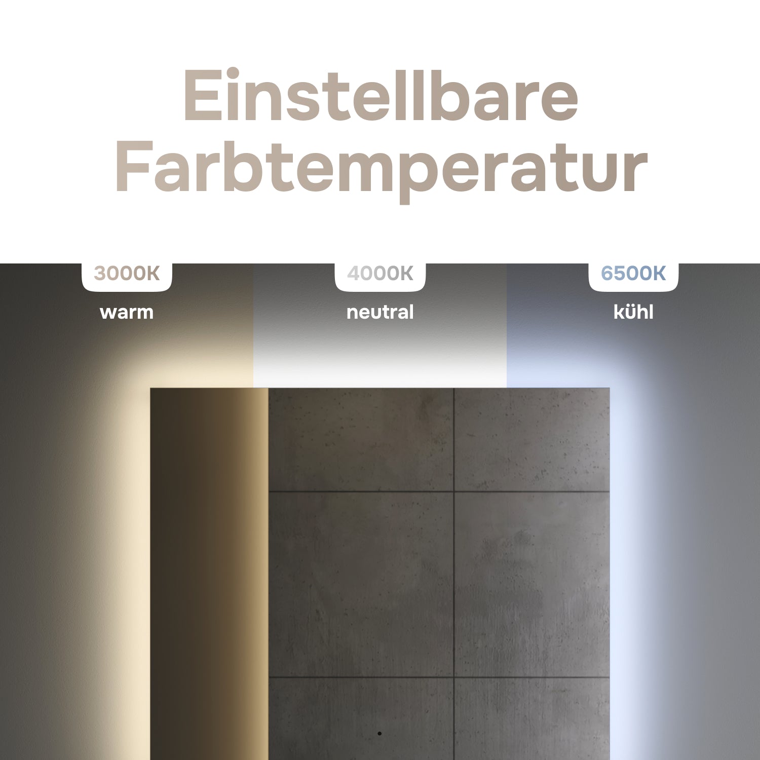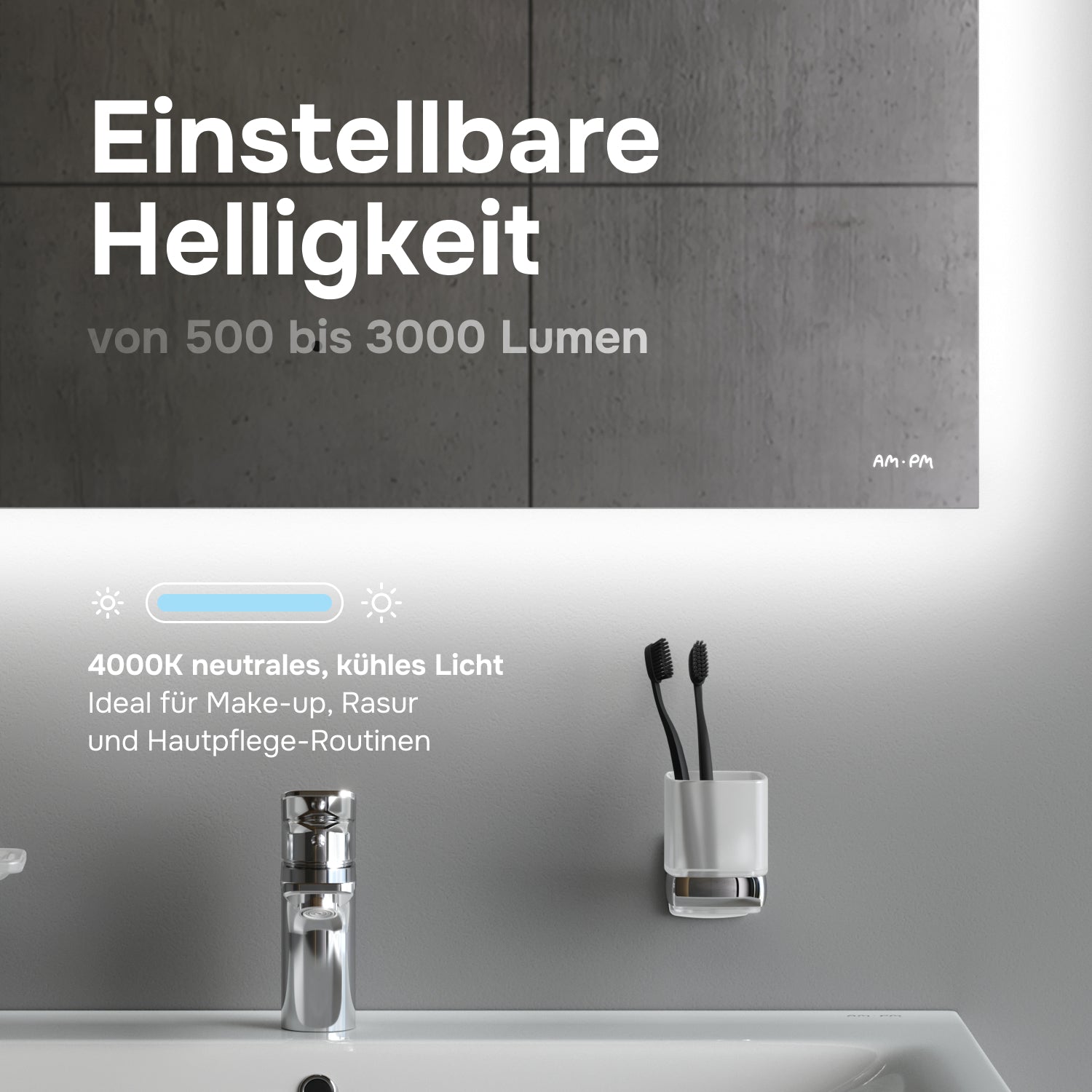 Le miroir de salle de bain AM. PM Hit 80 cm à LED allie design moderne et confort d'utilisation au quotidien. Son rétroéclairage LED intégré crée un élégant effet flottant et une ambiance raffinée. Grâce à son capteur sans contact, la surface du miroir reste impeccable, sans traces de doigts, tandis que l'éclairage à intensité variable avec trois températures de couleur offre l'ambiance idéale en toute circonstance. La fonction antibuée garantit une vision claire en toutes circonstances, même après la douche. Le verre miroir AGC de haute qualité, avec son bord biseauté, assure une réflexion nette, une résistance à la corrosion et une utilisation en toute sécurité dans l'environnement humide de la salle de bain.