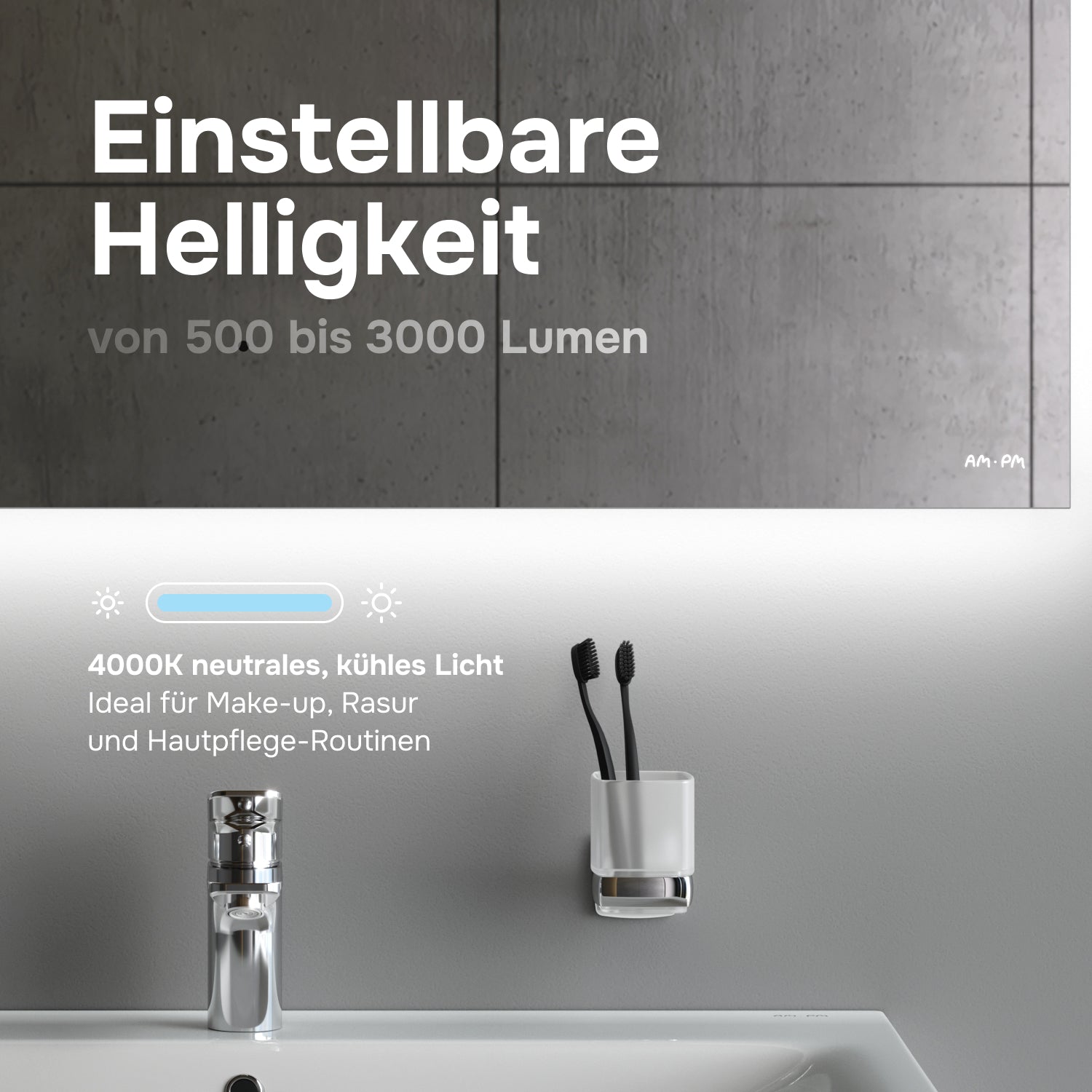 Le miroir de salle de bain LED AM. PM Hit de 100 cm allie design moderne et confort d'utilisation au quotidien. Son rétroéclairage LED intégré crée un élégant effet flottant et une ambiance raffinée. Grâce à son capteur sans contact, la surface du miroir reste impeccable, sans traces de doigts, tandis que l'éclairage à intensité variable avec trois températures de couleur offre l'ambiance idéale en toute circonstance. La fonction antibuée garantit une vision claire en toutes circonstances, même après la douche. Le verre miroir AGC de haute qualité, avec son bord biseauté, assure une réflexion nette, une résistance à la corrosion et une utilisation en toute sécurité dans l'environnement humide de la salle de bain.