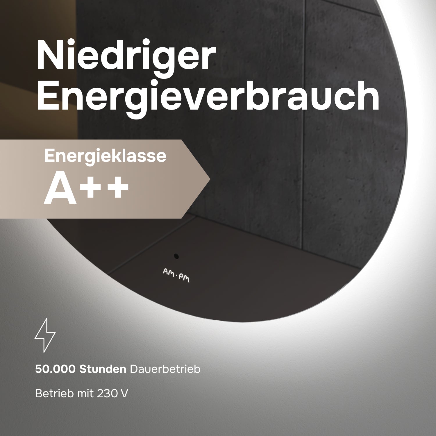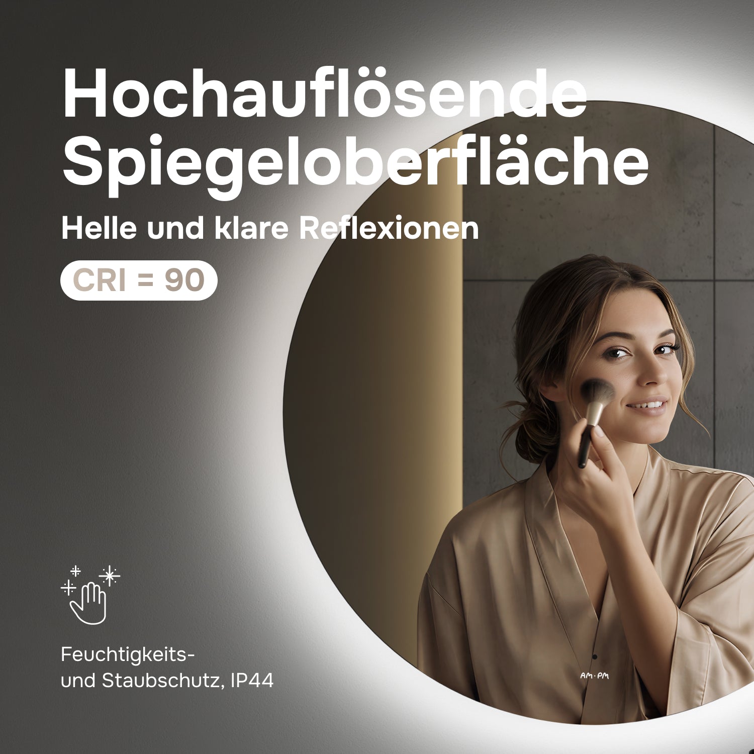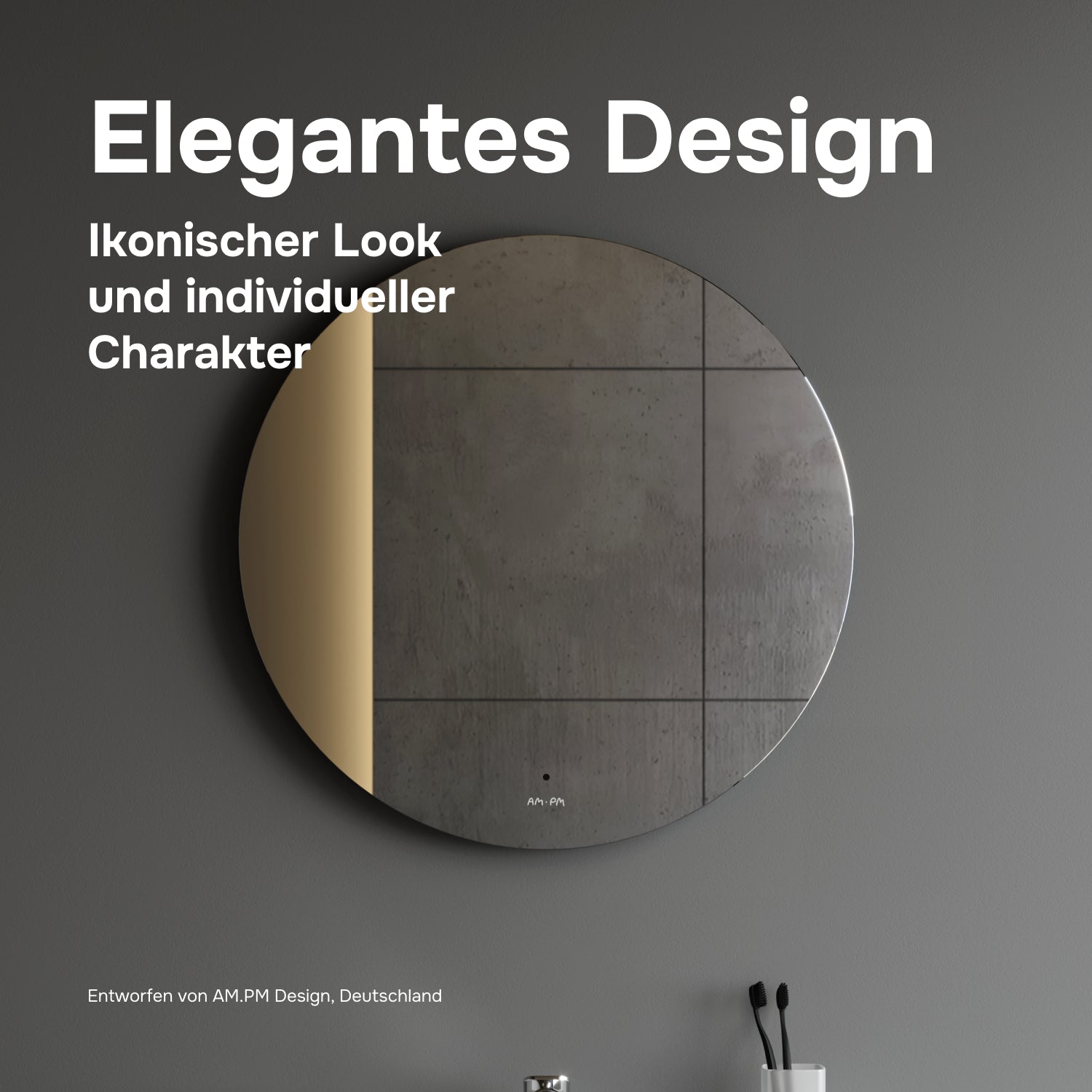 Le miroir de salle de bain LED AM. PM Hit 60 cm allie design moderne et confort d'utilisation au quotidien. Son rétroéclairage LED intégré crée un élégant effet flottant et une ambiance raffinée. Grâce à son capteur sans contact, la surface du miroir reste impeccable, sans traces de doigts, tandis que l'éclairage à intensité variable avec trois températures de couleur offre l'ambiance idéale en toute circonstance. La fonction antibuée garantit une vision claire en toutes circonstances, même après la douche. Le verre miroir AGC de haute qualité, avec son bord biseauté, assure une réflexion nette, une résistance à la corrosion et une utilisation en toute sécurité dans l'environnement humide de la salle de bain.