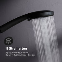 • BRAUSE: Die Handbrause mit 5 Strahlarten – Spray, Bubbling, EnerJet, Spray + Bubbling und Spray + EnerJet – besteht aus hochwertigem, umweltfreundlichem ABS-Kunststoff, der kratzfest und leicht zu reinigen ist. Der Umsteller ermöglicht einen schnellen Wechsel zwischen Handbrause und der Deckenbrause aus Edelstahl.