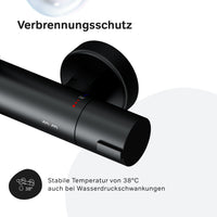Le mitigeur thermostatique de douche est équipé d'une cartouche thermostatique dotée d'un capteur de température très sensible et d'une fonction d'arrêt de sécurité à 38 °C–vous êtes ainsi protégé efficacement contre les brûlures, même en cas de coupure soudaine d'eau froide.