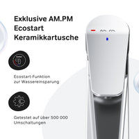 Une technologie précise pour votre confort : la température de l'eau se règle facilement par simple actionnement du levier. La cartouche céramique SoftMotion de 35 mm de diamètre a été développée exclusivement pour AM. PM. L'eau qui traverse l'aérateur est mélangée à de l'air pour éviter les éclaboussures. De plus, la technologie Rub&Clean préserve l'aérateur du calcaire. Sept fois supérieur aux normes EN : testé pour 500 000 utilisations.