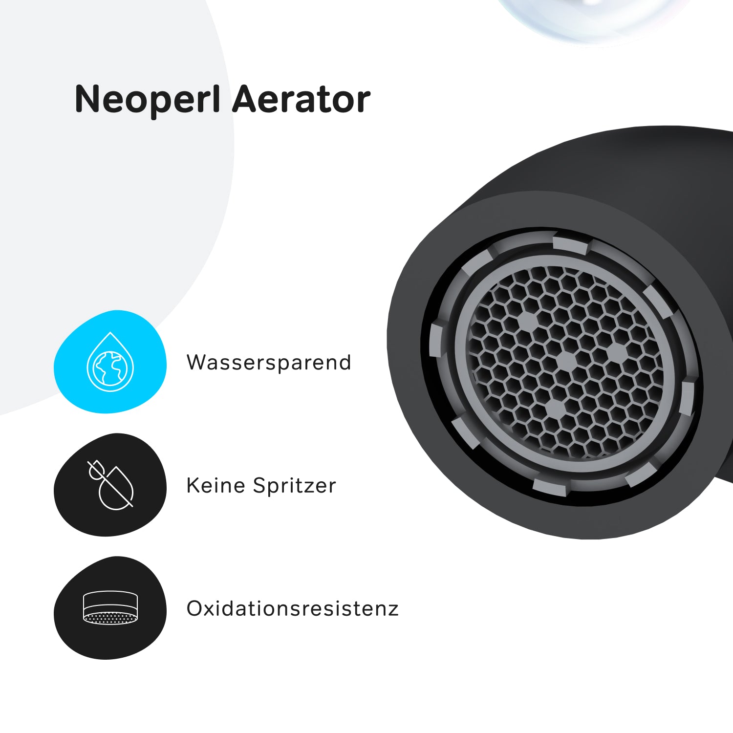 Die 35-mm-SoftMotion-Keramikkartusche ermöglicht eine optimale Temperaturregelung und hält Druckschwankungen stand. Dank des Neoperl-Luftsprudlers wird der Wasserstrahl mit Luft angereichert, wodurch Spritzwasser der Vergangenheit angehört.