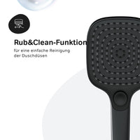 Durchdachte Details für Ihren Komfort: Die teleskopische Duschstange ist stufenlos in der Höhe verstellbar und passt sich so ideal der Körpergröße jedes Nutzers an. Die rechteckige Form, die vergrößerten Brauseköpfe sowie die drei Strahlarten der Handbrause sorgen für ein echtes Spa-Erlebnis zu Hause.