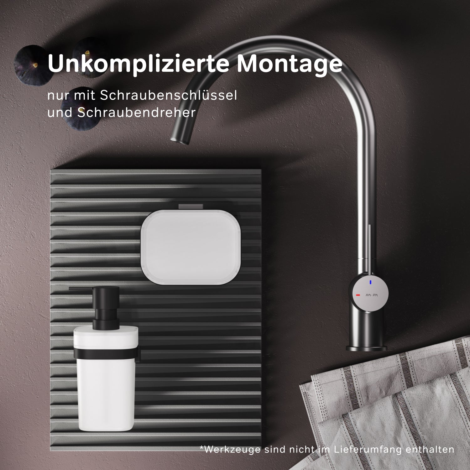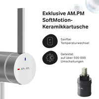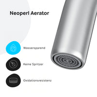 La fonction EcoStart–une solution élégante et écologique pour votre maison : en position centrale, l'eau froide coule automatiquement. Pour l'eau chaude, tournez le levier vers la gauche ; le tourner vers la droite bloque l'arrivée d'eau. En optimisant l'amplitude de mouvement, vous pouvez réduire votre consommation d'eau jusqu'à 40 % par mois. Autre avantage : le robinet s'installe directement au mur, idéal pour les petites cuisines.