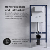 • VORWANDELEMENT: für alle Toilettenschüsseln, erhöhtes Haltbarkeitsniveau- WC-Hängestangen können bis zu 400 kg tragen. Ideal für kleines Bad oder Gäste-WC: Dank des flachen Spülkastens - 120 mm tief - sehr platzsparend. Geräuscharmes Füllventil - Klasse II gemäß der europäischen Norm EN 14124. Erhöhte Profildicke, verstärkter Wasserzulaufschlauch, doppelter Abfluss und Dichtungen für den Wasserzulauf. Wasseranschluss auf der Rückseite von oben.